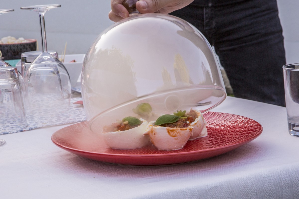 Eine Burrata, eine andere Form des beliebten Mozzarella-Käses, füllt Murer mit einer Mischung aus gegrilltem Paprika und klein gehackten, gedünsteten Zwiebeln. Das Ganze leicht säuerlich abgeschmeckt und effektvoll unter einer rauchgefüllten Glasglocke präsentiert.