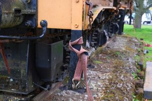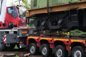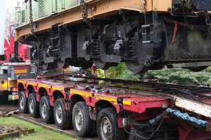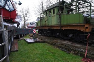 Bereits am Freitag hatte die belgische Transportfirma Dick alles vorbereitet, um am Samstagmorgen um 7.00 Uhr mit dem Beladen beginnen zu können. Denn vor dem Transport kommt das Laden der von der Firma im Vorfeld auf rund 80 Tonnen Gewicht geschätzten Elektrolok. Im Endeffekt wiegt sie 67,5 Tonnen, wie die Transportspezialisten beim Anheben herausfanden. Um Punkt 9.34 Uhr waren die Räder der Lokomotive in der Luft. Ein riesiger Kran hievte sie in wenigen Minuten auf den Tieflader. Und dann begann das Feintuning. Rund eine Stunde lang kalibrierten die drei Experten der auf Sondertransporte spezialisierten Firma die Ladung, damit beim Transport nichts schiefgehen konnte.