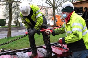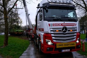 Der Zeitplan wurde so weit eingehalten, dass die Abfahrt der von der Polizei eskortierten Schwertransporter auf 12.30 Uhr vorgezogen werden konnte. Via Boulevard Grande-Duchesse Charlotte, Bd. Charles de Gaulle, Raemericher Kreisverkehr und den Tunnel der Liaison Micheville erreichte der Konvoi die früheren Hangars der Firma Parisotto in der Belvaler Straße kurz nach 13.00 Uhr.