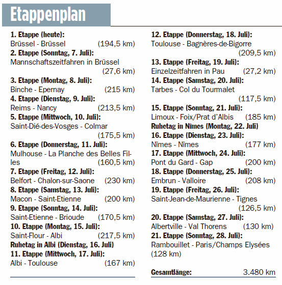 Während der ganzen Tour warten 30 mehr oder weniger schwere Anstiege auf die Konkurrenten (7 in den Vogesen, 6 im Zentralmassiv, 8 in den Pyrenäen, 9 in den Alpen). Das Einrollen beginnt heute beim „Grand départ“ in Brüssel. Die belgische Hauptstadt ist zum zweiten Mal nach 1958 (Schlusssieger Charly Gaul) Startort, hier ist man seit Wochen dabei, den 50. Jahrestag des ersten Toursiegs von Eddy Merckx (1969) gebührend zu feiern.