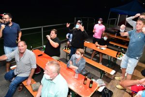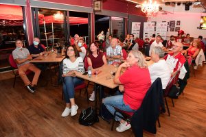 Erste Station, 19.15 Uhr in Lallingen. Es riecht bereits nach „Kotletten“, während die Frauenmannschaft ihre Runden auf dem Trainingsplatz dreht. Obschon es bis zum Anpfiff noch 45 Minuten dauern wird, haben die ersten hartgesottenen Fans bereits auf den Plastikstühlen zwischen Rasen und „Buvette“ Platz genommen. Unter ihnen auch Victor Matos, der sich normalerweise um das Material der ersten Mannschaft kümmert. Stefan Guden, Mitglied der Jugendkommission, erklärt, warum der Verein entschieden hat, zwei Orte für die Übertragung der Partie auszuwählen. „Wir haben hier nur Platz für rund 40 Personen. Es haben sich ein paar weniger angemeldet.“ Distanzen, Masken und Desinfektionsgel gehören mittlerweile zur Standardausrüstung. Für die Bewirtung der Gäste gelten die aktuellen Horesca-Regeln. „Das Geld, das wir heute hier einnehmen, werden wir nutzen, um die Schiedsrichter bei den Begegnungen unserer Nachwuchsspieler zu bezahlen. Diese Einnahmen fehlten zuletzt, da die Buvette ja geschlossen war.“